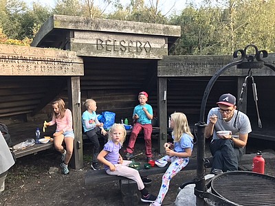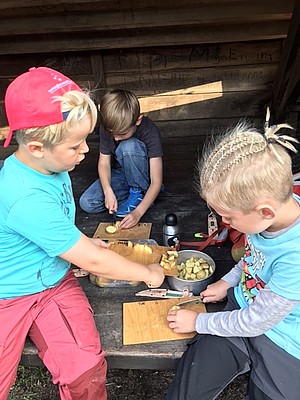 Eftersom vi träffades ganska sent påbörjade vi matlagningen ganska omgående. Det fanns också tid till att vara på naturlekplatsen, klättra i träd och tälja grillpinnar. Alla fick diska sin egen mattallrik och sedan grillade vi marshmallows och åt dem med mariekex och choklad, goda S’mores, innan tandborstning och godnattsaga vid lägerelden.